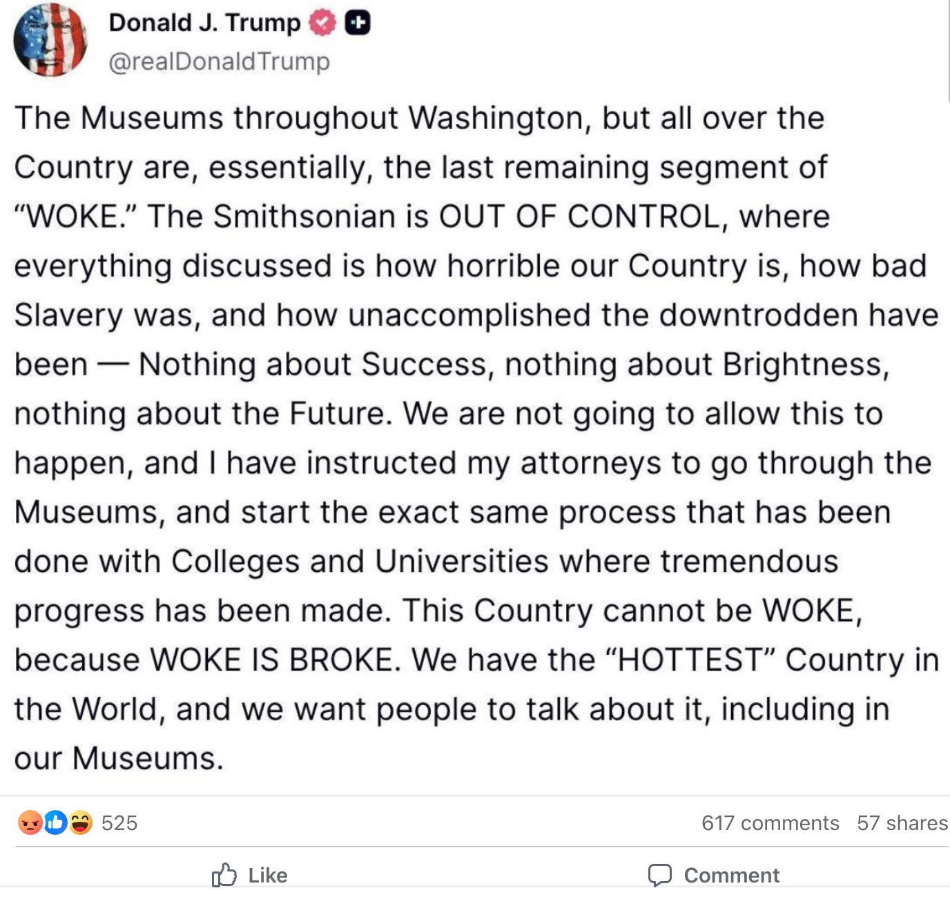 President Trump himself sparked more direct outrage when he took to Truth Social in August, lashing out at the Smithsonian Institute for allegedly focusing their exhibits on “how horrible our Country is” and “how bad Slavery was… Nothing about Success, nothing about Brightness, nothing about the Future.” Even a charitable interpretation of the President’s approach to American history — wanting to focus on and highlight the “brightness” and “success” of the American story — can’t avoid the unfortunate theme of these decisions. The Trump administration’s attitude seems to be that any reference to the darker episodes of American history, like slavery, is “woke” revisionism.